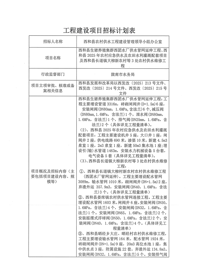 西和縣生豬養(yǎng)殖集群西團水廠供水管網(wǎng)延伸工程、 西和縣2025年農(nóng)村應急供水及農(nóng)田水利灌溉配套項目及西和縣長道鎮(zhèn)大柳新農(nóng)村等3處農(nóng)村供水維修工程
