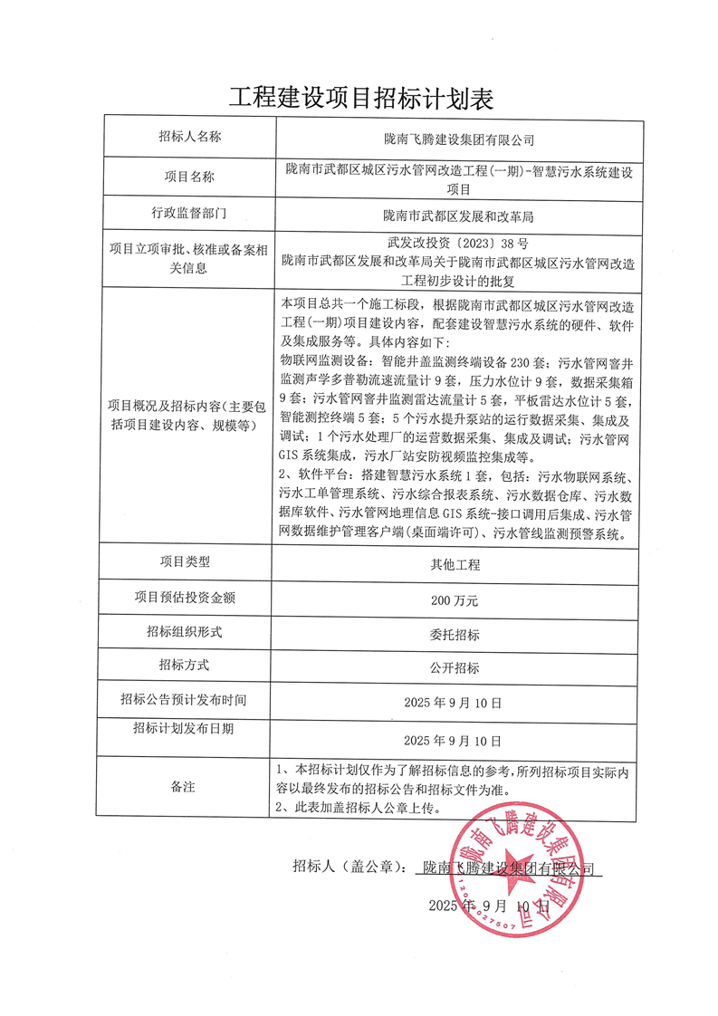 隴南市武都區(qū)城區(qū)污水管網(wǎng)改造工程(一期)-智慧污水系統(tǒng)建設(shè)項(xiàng)目