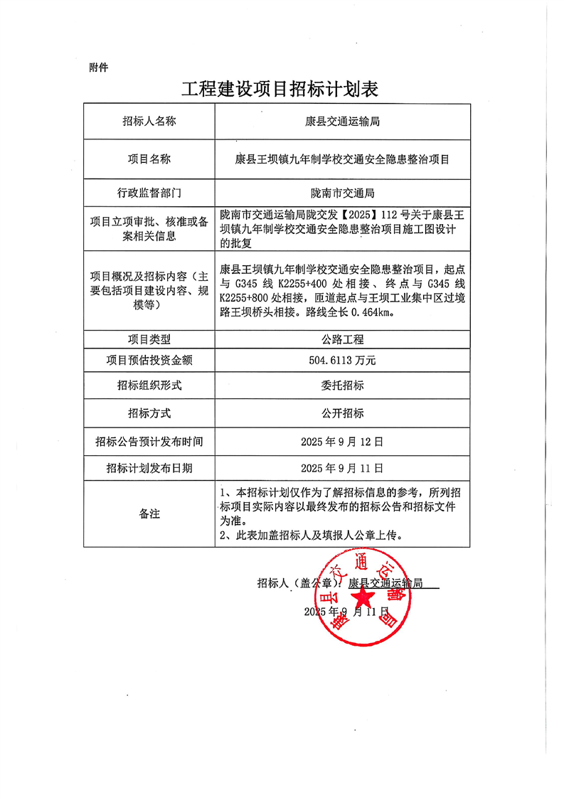 康縣王壩鎮(zhèn)九年制學校交通安全隱患整治項目